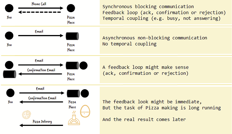 - Asynchronous non-blocking: A call is done by sending a message using messaging infrastructure. In this case, the sender is not blocked. This is you sending an email to the pizza place. The missing feedback loop here can be a problem — you might not feel confident that the pizza place received your email. This is why an email confirmation back to you makes a lot of sense, which can be delivered asynchronously again.