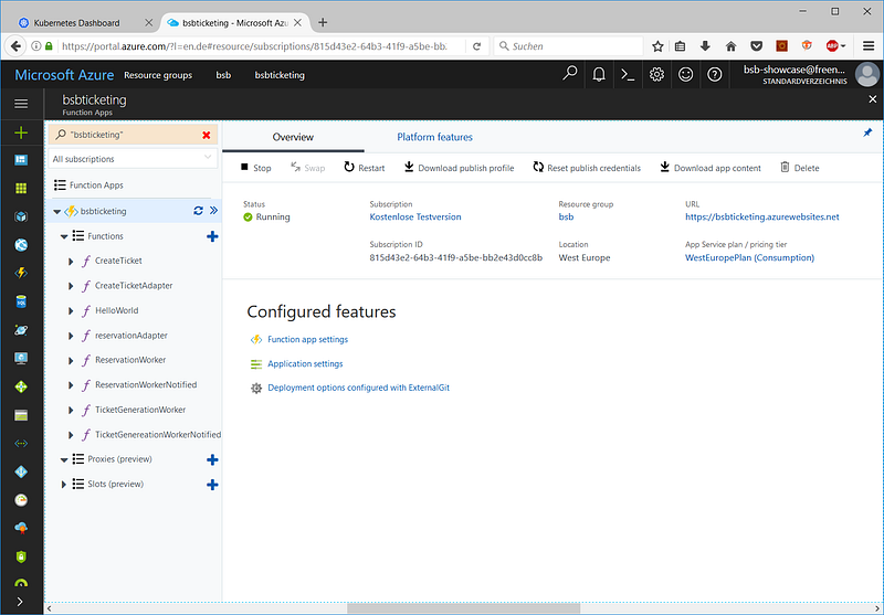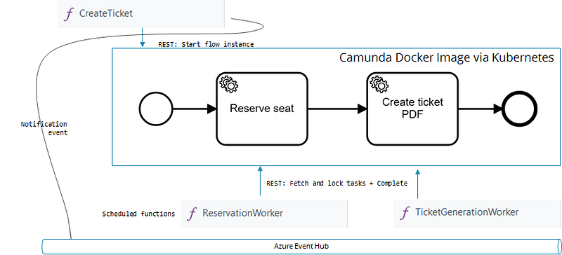 We now used Docker and Kubernetes to run the orchestration engines for our ticket flow — as described in more details below. But now let’s do some real business logic — as serverless functions: