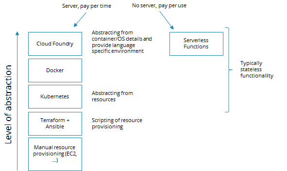 But wait, you still define your infrastructure on a very low level. Basically you say “Get me an AWS EC instance with this base image” and “get me a lambda function” and “get me this API gateway with some special configuration”. So it avoids clicking through the web consoles or use the AWS command line client, but if you want to just say “run me this docker image” it does not help you. This is especially true for AWS which makes it quite hard to run docker images at the moment.