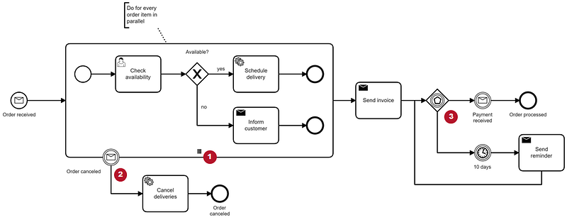 Of course, you could also implement your requirements differently. For example, you might implement all order cancelation logic entirely outside of the process model and just terminate the running order fulfillment instance via API. But note that by doing so, you will lose a lot of visibility around what happens in your process, not only during design time but also during operations or improvement endeavors.