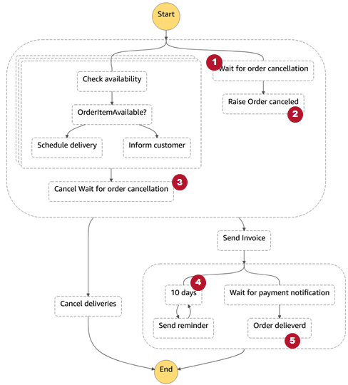 But this is where things get complicated. ASL does not offer reactions to external messages; thus, you cannot interrupt your running workflow instance if an external event happens, like the customer cancels their order. Therefore, you need a workaround. One possibility is to use a parallel branch that waits for the cancellation event in parallel to execute the multiple instance tasks, marked with (1) in the illustration above.